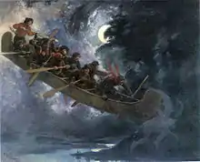 Déjà présente dans la légende de Rose Latulipe, elle intervient également dans celle de la chasse-galerie. Cette légende célèbre trouve sa forme la plus achevée sous la plume d'Honoré Beaugrand en 1900[39]. Racontée par le personnage de Joe le cook, la légende se passe la veille du Nouvel An, dans un camp de bûcherons, en pleine forêt. À la proposition de son ami Baptiste, le conteur se joint à une expédition pour aller en ville, à Lavaltrie. Pour s'y rendre, les personnages vont ainsi prendre part à une chasse-galerie. Cette pratique consiste à prêter serment au diable afin d'obtenir, pour une nuit, un canot d'écorce magique permettant de voyager dans le ciel. En échange de ce canot, les passages doivent respecter certaines règles : pendant la durée du voyage, ils doivent éviter de prononcer le nom de Dieu et de heurter une croix ou un clocher d'église. Celui qui enfreint les règles perd son âme. Réjoui à l'idée de pouvoir retrouver son amoureuse le temps d'une nuit, le narrateur accepte l'offre. Les passagers prennent le canot et se rendent à Lavaltrie, sans problèmes. Ils fêtent le réveillon dans la joie. Lorsque vient le temps de repartir, les choses se gâtent. Baptiste, l'ami du narrateur, est ivre alors qu'il doit tenir le gouvernail du canot. Frôlant la catastrophe à plusieurs reprises durant le trajet, dans un ultime geste d'insolence, l'ivrogne profère un juron retentissant. Le canot frappe alors un arbre qui sauve les passagers par miracle. Ceux-ci atterrissent dans un banc de neige, où ils sont retrouvés le lendemain, sains et saufs[40].