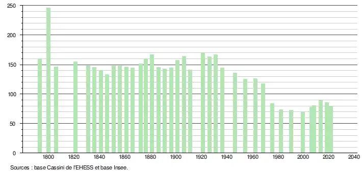 L'évolution du nombre d'habitants est connue à travers les recensements de la population effectués dans la commune depuis 1793. Pour les communes de moins de 10 000 habitants, une enquête de recensement portant sur toute la population est réalisée tous les cinq ans, les populations légales des années intermédiaires étant quant à elles estimées par interpolation ou extrapolation[37]. Pour la commune, le premier recensement exhaustif entrant dans le cadre du nouveau dispositif a été réalisé en 2008[38].