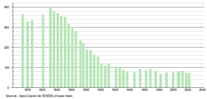 L'évolution du nombre d'habitants est connue à travers les recensements de la population effectués dans la commune depuis 1793. Pour les communes de moins de 10 000 habitants, une enquête de recensement portant sur toute la population est réalisée tous les cinq ans, les populations légales des années intermédiaires étant quant à elles estimées par interpolation ou extrapolation[27]. Pour la commune, le premier recensement exhaustif entrant dans le cadre du nouveau dispositif a été réalisé en 2007[28].
