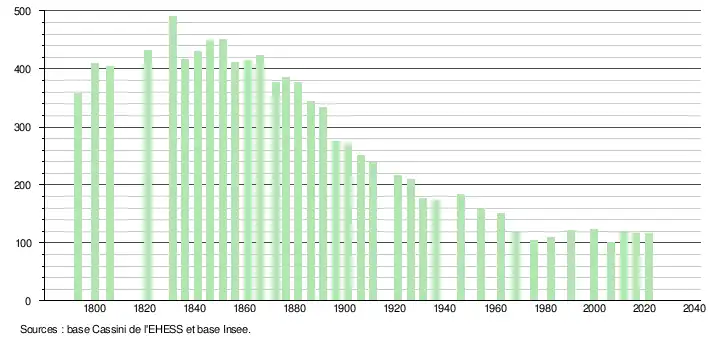 L'évolution du nombre d'habitants est connue à travers les recensements de la population effectués dans la commune depuis 1793. Pour les communes de moins de 10 000 habitants, une enquête de recensement portant sur toute la population est réalisée tous les cinq ans, les populations légales des années intermédiaires étant quant à elles estimées par interpolation ou extrapolation[22]. Pour la commune, le premier recensement exhaustif entrant dans le cadre du nouveau dispositif a été réalisé en 2006[23].