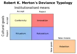 Aucune société, même la plus contraignante, n'a jamais pu complètement empêcher la déviance. Chez Durkheim, la déviance est nécessaire pour qu'une évolution se produise ; sans déviance à la norme, il n'y a pas de changement, que de la reproduction sociale. Cependant, les sanctions sociales sont si fortes qu'il parle de « force contraignante » qui s'observe spécifiquement lorsqu'un individu tente de transgresser une norme sociale. Il observe que « le crime est normal »[16]. La conformité n'est que l'une des attitudes possibles de l'individu face au contrôle social : Robert K. Merton en distingue quatre autres, du ritualisme à la rébellion (voir ci-contre)[17].