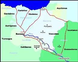 - (es) José Maria Blázquez Martínez, « Los vascos y sus vecinos en las fuentes literarias griegas y romanas de la Antigüedad », IV Symposium de Prehistoria Peninsular, Pampelone, Institución Príncipe de Viana, , p. 177-205 (lire en ligne)
