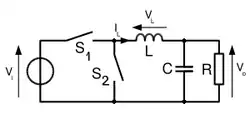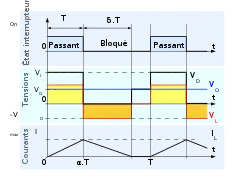 Un circuit de commande de l'interrupteur le fait alterner à un rythme adéquat pour obtenir la tension désirée. La diode peut être remplacée par un autre interrupteur. Une charge capacitive C -- voir figure 1 -- en sortie aux bornes du dispositif lisse la tension qu'il fournit.