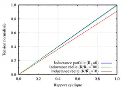 - Le courant normalisé, défini par . Le terme correspond à l'augmentation maximale de courant que l'on peut atteindre lors d'un cycle (variation du courant dans l'inductance atteinte pour ). On obtient donc, en régime permanent, égale 0 quand le courant de sortie est nul, et 1 pour le courant maximum que peut fournir le convertisseur.