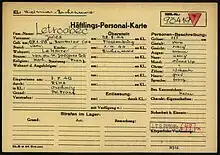 Le , 1 175 hommes environ quittent le camp de Royallieu (Compiègne) administré et gardé par le SD[9]. Ils sont entassés dans des wagons de marchandises. Tous jettent des lettres sur la voie ferrée qui sont recueillies par les cheminots et transmises à leurs destinataires[10]. Trois d’entre eux réussissent à s’évader avant la frontière. À leur arrivée à Auschwitz, les déportés sont photographiés au camp principal derrière une plaque portant leur matricule et la mention BV-F (criminels professionnels français). Ils ne sont pas placés en quarantaine, ni immédiatement tatoués, car le tatouage n’a été généralisé qu’en 1943. Ils se voient attribuer d’abord le triangle vert des détenus de droit commun, puis quelques jours plus tard le triangle rouge des détenus politiques. La Gestapo du camp leur applique le traitement des prisonniers NN (sigle de Nacht und Nebel, Nuit et brouillard) : leur destination doit rester secrète, ils ne peuvent recevoir ni lettre ni colis, ni être envoyés dans des kommandos éloignés du camp principal ou de Birkenau.
