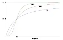représente la fraction des sites comportant un ligand lié, [L] est la concentration de ligand et est la constante de dissociation apparente. La constante n s'appelle la constante de Hill et décrit le degré de coopérativité de la fixation du ligand :