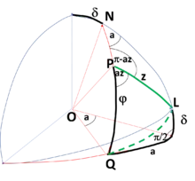 Grâce à la trigonométrie sphérique (formule des cosinus), le triangle sphérique du graphique livre les relations suivantes :