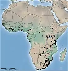 Cette espèce se rencontre en Afrique subsaharienne[1] ; de la Sierra Leone à l'Éthiopie et à l'Afrique du Sud[2].