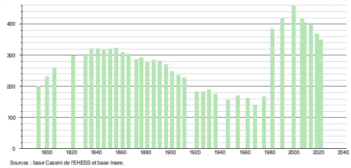 L'évolution du nombre d'habitants est connue à travers les recensements de la population effectués dans la commune depuis 1793. Pour les communes de moins de 10 000 habitants, une enquête de recensement portant sur toute la population est réalisée tous les cinq ans, les populations légales des années intermédiaires étant quant à elles estimées par interpolation ou extrapolation[22]. Pour la commune, le premier recensement exhaustif entrant dans le cadre du nouveau dispositif a été réalisé en 2008[23].