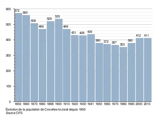 La population de Corcelles-le-Jorat est de 572 personnes en 1850. Elle baisse à 469 personnes en 1880, puis remonte à 535 personnes en 1900. Le nombre d'habitants baisse ensuite jusqu'à 353 en 1980, puis remonte à 412 en 2000. Le graphique suivant résume l'évolution de la population de Corcelles-le-Jorat entre 1850 et 2010[8] :