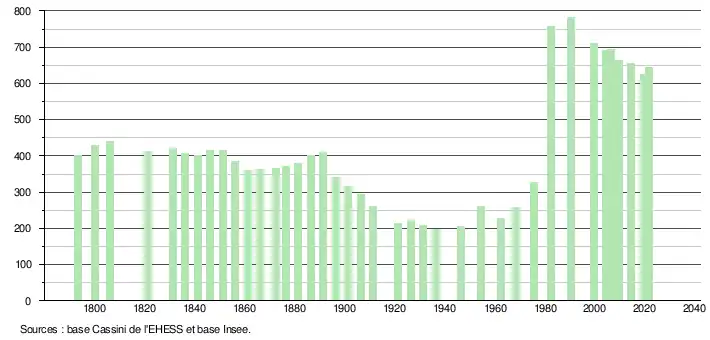 L'évolution du nombre d'habitants est connue à travers les recensements de la population effectués dans la commune depuis 1793. Pour les communes de moins de 10 000 habitants, une enquête de recensement portant sur toute la population est réalisée tous les cinq ans, les populations légales des années intermédiaires étant quant à elles estimées par interpolation ou extrapolation[13]. Pour la commune, le premier recensement exhaustif entrant dans le cadre du nouveau dispositif a été réalisé en 2004[14].