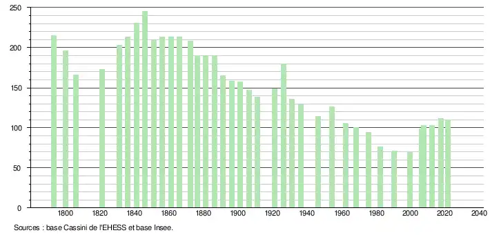L'évolution du nombre d'habitants est connue à travers les recensements de la population effectués dans la commune depuis 1793. Pour les communes de moins de 10 000 habitants, une enquête de recensement portant sur toute la population est réalisée tous les cinq ans, les populations légales des années intermédiaires étant quant à elles estimées par interpolation ou extrapolation[13]. Pour la commune, le premier recensement exhaustif entrant dans le cadre du nouveau dispositif a été réalisé en 2007[14].