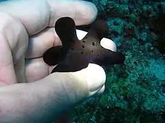 La coriocelle des Maldives peut atteindre une taille maximale de 10 cm[2]. Son aspect physique est caractérisé par cinq digitations dorsales. La teinte du corps varie du bleu ardoise au brun foncé, avec des reflets verts, bleus ou rougeâtres, et des taches noires qui lui confère l'apparence d'une éponge, afin de passer inaperçue aux yeux des prédateurs (et des plongeurs), surtout lorsque cette dernière est immobile sur le récif. Ses chairs renferment une fine et fragile coquille nacrée en forme d'« oreille ».