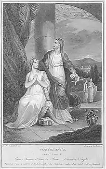- Volumnia, sa mère, matrone attachée aux vertus romaines essentiellement viriles[5], réalise ses ambitions à travers son fils. Contrairement à Coriolan, dont elle partage l'orgueil et le mépris de la plèbe, elle est capable d'un certain machiavélisme : « J'ai un cœur aussi peu disposé que le vôtre, mais un cerveau qui guide l'usage de ma colère à des fins plus profitables[6]. »