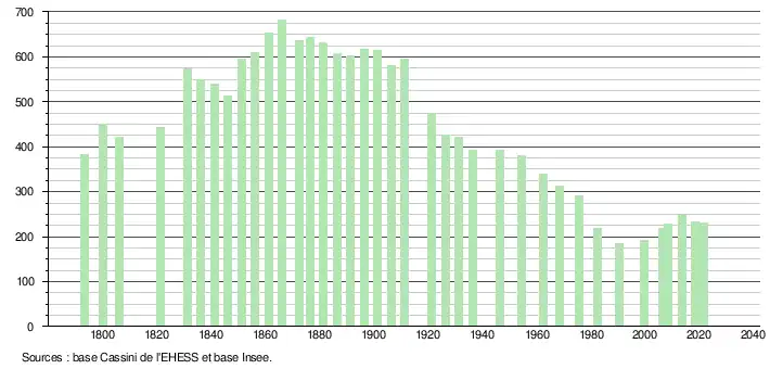 L'évolution du nombre d'habitants est connue à travers les recensements de la population effectués dans la commune depuis 1793. Pour les communes de moins de 10 000 habitants, une enquête de recensement portant sur toute la population est réalisée tous les cinq ans, les populations légales des années intermédiaires étant quant à elles estimées par interpolation ou extrapolation[25]. Pour la commune, le premier recensement exhaustif entrant dans le cadre du nouveau dispositif a été réalisé en 2008[26].