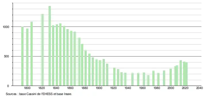 L'évolution du nombre d'habitants est connue à travers les recensements de la population effectués dans la commune depuis 1793. Pour les communes de moins de 10 000 habitants, une enquête de recensement portant sur toute la population est réalisée tous les cinq ans, les populations légales des années intermédiaires étant quant à elles estimées par interpolation ou extrapolation[31]. Pour la commune, le premier recensement exhaustif entrant dans le cadre du nouveau dispositif a été réalisé en 2008[32].