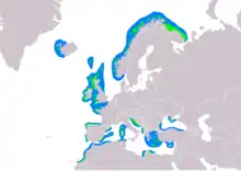 - Le cormoran huppé atlantique (Gulosus a. aristotelis) occupe le nord de l'aire de répartition, depuis l'Islande et le nord de la Scandinavie jusqu'aux côtes atlantiques de la péninsule Ibérique. Dans cet ensemble, il n'habite guère que les rivages les plus océaniques, évitant totalement la mer Baltique et la quasi-totalité de la Mer du Nord.