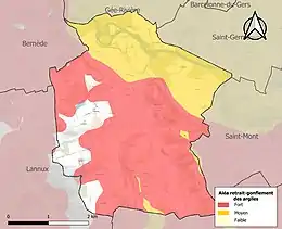 Le retrait-gonflement des sols argileux est susceptible d'engendrer des dommages importants aux bâtiments en cas d’alternance de périodes de sécheresse et de pluie. 89,2 % de la superficie communale est en aléa moyen ou fort (94,5 % au niveau départemental et 48,5 % au niveau national). Sur les 82 bâtiments dénombrés sur la commune en 2019, 73 sont en aléa moyen ou fort, soit 89 %, à comparer aux 93 % au niveau départemental et 54 % au niveau national. Une cartographie de l'exposition du territoire national au retrait gonflement des sols argileux est disponible sur le site du BRGM[25],[Carte 3].