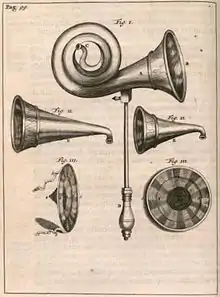 - 1624 : Le recueil Récréation mathématique, généralement attribué au mathématicien jésuite Jean Leurechon, mais qui est probablement écrit par l'ingénieur lorrain Jean Appier Hanzelet (1596-1647)[3], suggère un cornet acoustique et signale que quelques grands seigneurs se servent déjà de ce type d'appareil, en forme d'entonnoir, en argent, cuivre ou toute autre matière résonnante[4].