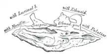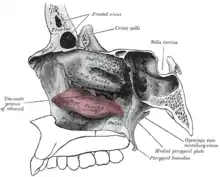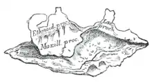 - le processus maxillaire du cornet nasal inférieur qui se recourbe en dehors et en bas du hiatus maxillaire qu'il obture en partie ; son bord postérieur s'articule avec le processus maxillaire de l'os palatin ;