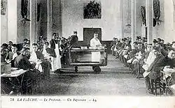 Dès le , moins d'un mois après le déclenchement de la guerre, le service de santé de la 4e région militaire occupe les locaux du Prytanée, qui est alors transformé en hôpital militaire[47],[48]. Le conflit entraîne dans un premier temps la prolongation des vacances scolaires et l'établissement ne rouvre ses portes qu'au début du mois de décembre 1914[47], alors que les blessés sont répartis dans les autres formations sanitaires de la ville[49]. Le nombre d'élèves baisse considérablement, en raison de l'engagement de certains d'entre eux, tandis que d'autres ont abandonné leurs études pour rejoindre leur famille. Le nombre des candidats à l'admission au Prytanée diminue de moitié entre le début et la fin de la guerre. De la même manière, le personnel militaire de l'établissement est presque entièrement remplacé après la mobilisation par des officiers retraités ou grands blessés[50].