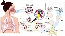 Les chauves-souris et les oiseaux, en tant que vertébrés volants à sang chaud, seraient les hôtes idéaux pour les coronavirus assurant l'évolution et la dissémination du virus[5]. Ces coronavirus sont normalement spécifiques à un taxon animal comme hôte, mammifères ou oiseaux selon leur espèce ; mais ils peuvent parfois changer d'hôte à la suite d'une mutation. Leur transmission interhumaine se produit principalement par contacts étroits via des aérosols respiratoires générées par les éternuements, la toux ou la phonation. Plus de 500 types de coronavirus ont été isolées chez la chauve-souris et il existerait plus de 5 000 types de coronavirus[6].