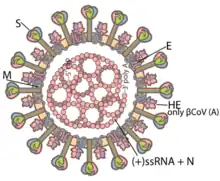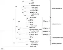 Les coronavirus (CoV) sont des virus à ARN monocaténaire de sens positif (groupe IV de la classification Baltimore) correspondant à la sous-famille Orthocoronavirinae de la taxonomie de l'ICTV[33], dans la famille Coronaviridae, et de l'ordre Nidovirales[34],[35].