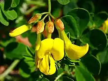 Les fleurs groupées par 12-20 en ombelles terminales denses portées par un pédoncule de 6–10 cm bien plus long que la feuille ; les fleurs sont jaunes, à odeur fétide, longues de 7–12 mm ; le calice est largement capmanulé, plus court que le pédoncule floral ; l'étendard spatulé est plus ou moins redressé. Le fruit est une gousse articulée, droite, pendante, de 25 à 30 mm de longueur, à quatre angles peu marqués. La floraison a lieu de mai à juillet[4].
