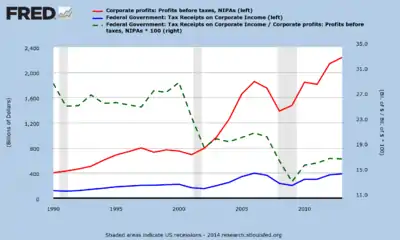 Le pouvoir des entreprises peut également accroître l'inégalité des revenus. Joseph Stiglitz, lauréat du prix Nobel d'économie, écrivait en mai 2011 : « Une grande partie de l'inégalité actuelle est due à la manipulation du système financier, rendue possible par la modification des règles achetées et payées par l'industrie financière elle-même, un des meilleurs investissements qui aient jamais été faits. Le gouvernement a prêté de l'argent à des institutions financières à un taux d'intérêt proche de zéro et a fourni des sauvetages généreux à des conditions favorables lorsque tout le reste a échoué. Les régulateurs ont fermé les yeux sur le manque de transparence et les conflits d'intérêts. » Stiglitz a expliqué que les 1 % les plus riches gagnaient près du quart des revenus et possédaient environ 40% de la richesse[15].
