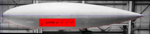 La mathématicienne et mécanicienne des fluides Hilda M. Lyon (en) a défini dans sa thèse[9] les formes d’un corps de moindre traînée, le modèle A, par l’équation : où est le rayon à l’abscisse relative et le diamètre maximal du corps. L’abscisse relative vaut comme toujours le quotient de la distance au point d’arrêt par la longueur du corps.