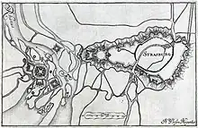 Ce corps de place est précédé des dehors (les demi-lunes et les tenailles) et des avancées (le glacis et le chemin couvert)[4].