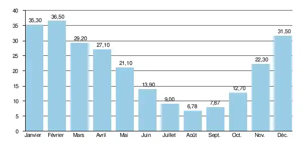 Les crues peuvent être importantes. Les QIX 2 et QIX 5 valent respectivement 210 et 290 m3/s. Le QIX 10 est de 350 m3/s, le QIX 20 de 400 m3, tandis que le QIX 50 se monte à 470 m3/s.