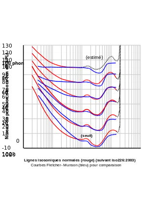 Le graphique à droite indique les courbes isosoniques de Fletcher et Munson, c'est-à-dire la sensibilité moyenne de l'oreille en fonction de la fréquence (en hertz) et du niveau sonore (en dB SPL). Elles montrent que la sensibilité de l'oreille varie fortement suivant la pression sonore.
