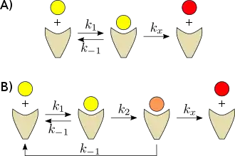 L'exemple de la figure de droite montre un problème abstrait dans lequel un mécanisme de correction cinétique peut être mis en place. L'objectif de la réaction et de transformer les billes jaunes () en billes rouges () si leur constante de dissociation avec le récepteur () est faible (c'est-à-dire qu'elles restent attachées longtemps). Le mécanisme en une seule étape (A) permet de produire les billes rouges avec un taux de production: