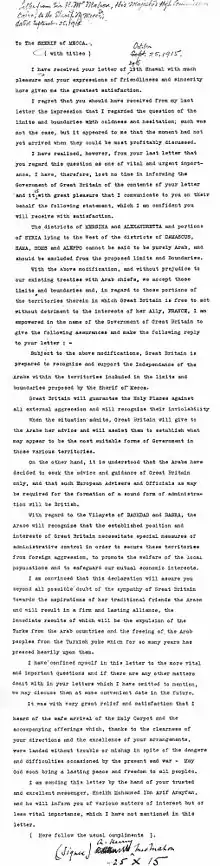 - Reconnaissance de l'indépendance des pays arabes ("the independance of the arab countries") dans les frontières explicitées par le Chérif (Au Nord, Mersine, au Sud l'Océan Indien, à l'Ouest la Méditerranée, à l'Est la frontière avec la Perse)[6]. Le Royaume-Uni reconnaît l'établissement d'un califat arabe. (Pour rappel, le Califat était depuis 1517 aux mains des Turcs de la Maison d'Osman ; après avoir été tenu à partir de 1261[7] par les Mamelouks d'Egypte, à la suite de la chute de Bagdad en 1258 devant les Mongols commandés par Houlagou[8]).