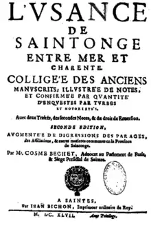 - 1re édition : L'usance de Saintonge, colligée des anciens manuscrits ... Avec deux traictez, l'un des secondes nopces, & l'autre du droict de reversion, Saintes, Jean Bichon, 1633.