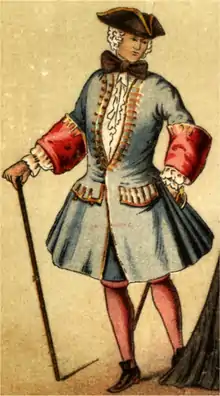 Les classes supérieures utilisaient les soies, les brocarts et le velours pour les costumes et les robes, pendant que les classes populaires et les paysans utilisaient la laine et le coton, qui étaient moins chers. Les vestes de la noblesse avaient les embellissements, des broderies et des douzaines de boutons qui étaient considérés comme des bijoux[3]. Les hommes des classes supérieures mettaient aussi des postiches blancs poudrés avec des boucles de cheveux près du visage et une queue. La classe ouvrière portait les vestes très peu ornées et les cheveux longs en queue de cheval nouée sur la nuque.