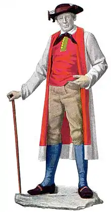 La culotte (Knüxen) s'arrêtant au-dessous du genou est de cuir clair et se porte avec des bas bleus et des souliers noirs à boucle d'argent.