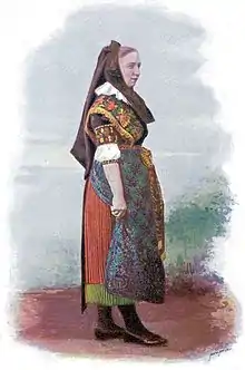 Le costume des femmes est de couleur claire avec une jupe jusqu'au chevilles de couleur rouge galonnée en bas d'un ruban vert et recouverte d'un tablier de couleur qui laisse voir les côtés et l'arrière de la jupe. Les femmes portent une blouse de dentelle blanche, dont les manches en ruché et le col (parfois orné d'une fraise de dentelle fermée par un nœud de rubans de soie) sont apparents, et qui sort d'un corsage de couleur noire ou bleu foncé fermé par de petits boutons. Il est recouvert d'un fichu croisé sur la poitrine dont le pan arrière pointe dans le dos. La blouse elle-même est recouverte d'un fichu à trois pointes de coton blanc.