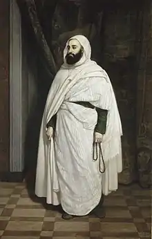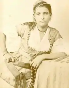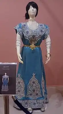 Une ceinture de brocart ou de soie rayée retient la robe au niveau de la taille. La coiffe rigide, pointue, couverte de broderies, appelée chéchia devient indispensable. La diffusion des premiers velours date du XVe siècle[54]. Durant la période ottomane, l'influence des costumes levantins qui pénètre par le biais d'Alger, occasionne une série non-négligeable de mutations[55]. Le caftan est ainsi introduit à l'instar d'autres villes algériennes[56].