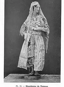 Les habitants de la ville de Tlemcen au riche passé ont montré et montrent encore un goût très raffiné pour l'habillement. C'est au XVIe siècle que l'art du costume sous l'influence ottomane atteint son apogée dans la cité[25]. Tlemcen, qui fut longtemps un centre d'échanges et de productions, devait surtout sa renommée à la fabrication de tapis et de tissages de laine, entrant dans la confection des haïk et des burnous ainsi que dans la sellerie brodée[26]. La Tlemcénienne est restée la plus traditionaliste des femmes d'Algérie[27]. Parmi les costumes citadins algériens, seul celui de Tlemcen réussit à sauvegarder l'ensemble de ses composantes anciennes[28].