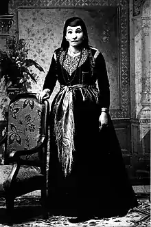 Toutefois, le costume des Constantinoises, semble plus statique que celui de la capitale. La chemise de dessous, avec ses manches enrichies de dentelles, la djoubba ou gandoura unie ou bicolore, la chéchia pointue et la majorité des composantes vestimentaires et des bijoux maintiennent leurs formes anciennes[55]. Seul le caftan fait exception puisqu'il s'allège et s'inspire du modèle algérois et devient la pièce la plus prestigieuse[57]. Les broderies apparaissent sur une panoplie de coiffes, voiles, voilettes, foulards, mouchoirs, écharpes et étoles[58]. Parmi les pièces brodées, le voile nuptial, appelé abrouq, conserve un statut privilégié, il est déposé sur la pointe de la chéchia conique qui est posée sur un fichu soyeux blanc, la meherma[58]. Cette chechia était inclinée et recouverte de sultanis ou de louis d'or[59].