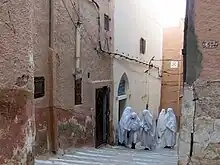 Le haïk se greffe au costume de sortie, il est tissé avec des fibres de laine et de soie, il s'exporte bien au-delà des frontières du royaume zianide. Les femmes le referment sur le visage en ne concédant qu'une petite ouverture devant l'un des deux yeux. Cette coutume serait elle aussi originaire d'Al-Andalus[30]. Ce haïk appelé ksa, était porté de la même façon dans le reste de l'Oranie[31].