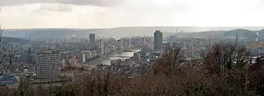 Panorama sur Liège depuis les Terrasses des Minimes, la Tour teutonique des Vieux Joncs. | |