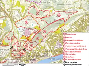 - Prairie des Filles de la Croix : propriété des Filles de la Croix installées dans l'ancien couvent des Capucines, cette prairie est difficilement accessible, soit par les nombreuses impasses de la rue Hors-Château, soit par le sentier de randonnée des Clématites[note 3]. Elle est régulièrement broutée par un troupeau de moutons et de chèvres itinérant. Cet espace est aussi très intéressant pour sa biodiversité, son paysage de bocage et les perspectives insolites qu'il offre sur la ville.