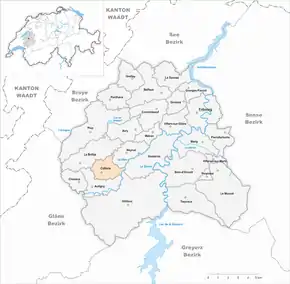 La commune est située sur l'axe routier et ferroviaire Romont-Fribourg[3], à 11 km au sud-ouest de Fribourg[4].