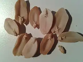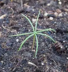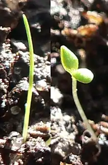 - germination épigée, implique que les cotylédons sont poussés au-dessus du sol. Normalement, le cotylédon lui-même contient très peu de nutriments dans les plantes présentant ce type de germination. Au lieu de cela, les premières feuilles embryonnaires, qui sont déjà repliées à l'intérieur du cotyledon, se développent et la photosynthèse commence à s'y dérouler rapidement[6]; ou