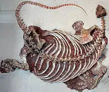 Le squelette postcranien est massif. Les côtes sont très longues, lourdes et incurvées pour former un corps bulbeux. Les côtes sont présentes sur toutes les vertèbres pré-sacrées et les premières vertèbres caudales. Les cinq côtes présacrées postérieures sont fusionnées aux apophyses transverses des vertèbres. Le sacrum contient trois vertèbres. Les épines neurales des vertèbres des plus gros spécimens deviennent proportionnellement plus hautes, en particulier dans la région pelvienne. Les membres sont courts et robustes. Le fémur est caractérisé par son extrémité proximale ayant un large plateau marqué par une marge surplombant légèrement la surface dorsale du fémur. Les mains et les pieds sont larges et courts, et se terminent par des phalanges unguéales fortes, acérées, et recourbées qui devaient soutenir des griffes puissantes. Les cicatrices musculaires et tendineuses sont largement développées[3].