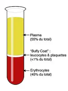 Au fond se trouvent les érythrocytes ou globules rouges, en surface, se trouve le plasma. Entre les deux se trouve une couche jaunâtre qui contient les leucocytes ou globules blancs et les plaquettes. C'est la couche leuco-plaquettaire.