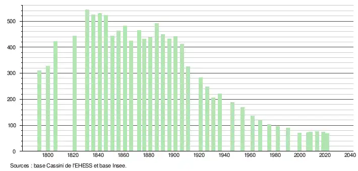 | L'évolution du nombre d'habitants est connue à travers les recensements de la population effectués dans la commune depuis 1793. Pour les communes de moins de 10 000 habitants, une enquête de recensement portant sur toute la population est réalisée tous les cinq ans, les populations légales des années intermédiaires étant quant à elles estimées par interpolation ou extrapolation[23]. Pour la commune, le premier recensement exhaustif entrant dans le cadre du nouveau dispositif a été réalisé en 2008[24]. En 2021, la commune comptait 69 habitants[Note 3], en diminution de 13,75 % par rapport à 2015 (Corrèze : −0,86 %, France hors Mayotte : +1,84 %). |
